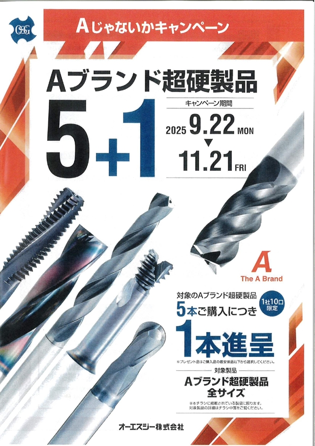 Aブランド超硬製品のキャンペーンが始まっております。 対象のAブランド超硬製品5本ご購入につき1本進呈となっております。詳しくは営業担当までお問い合わせください。 |